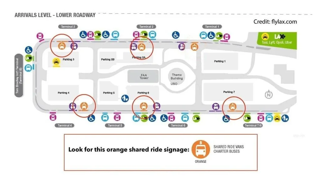Passengers should wait for their shuttle bus at the center island under the ORANGE ‘Shared Rides’ signs on the Lower/Arrivals Level.